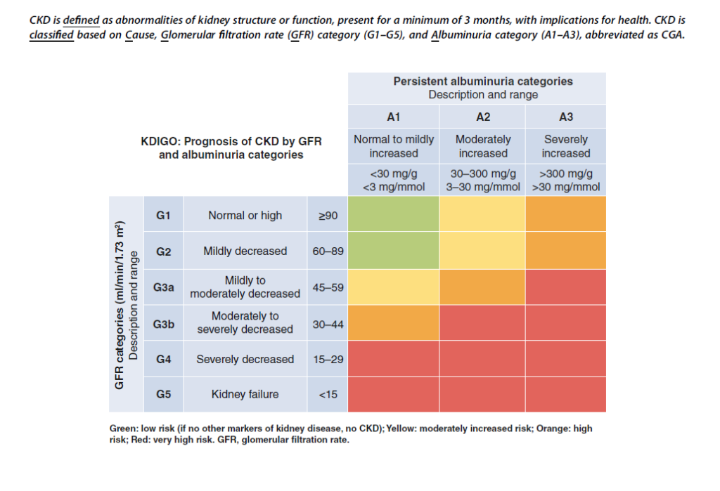 سیستم طبقهبندی بیماری مزمن کلیه (CKD) توسط KDIGO (سازمان بهبود نتایج جهانی بیماریهای کلیوی) یک معیار اساسی است که بر دو عامل اصلی استوار است: میزان فیلتراسیون گلومرولی تخمینی (eGFR) و نسبت آلبومین به کراتینین ادرار (UACR) یا همان دفع آلبومین.